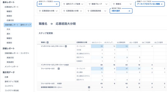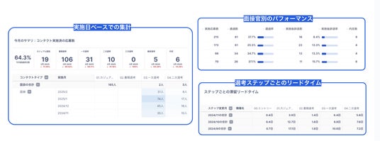 今回のアップデートにより、データの集計軸を拡充し、10ページのダッシュボードから、中長期での振り返りや選考官ごとの比較など、さまざまな用途に対応することが可能になります。さらに、「期間×職種×応募経路」といった複数の軸を掛け合わせたデータも可視化できるため、採用業務に必要な数値情報をすばやく正確に把握できます。