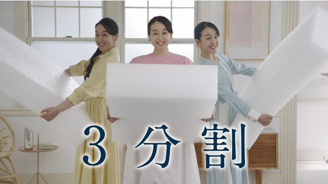 新CMは、ピンク、イエロー、ミントグリーンの3種類の衣装に身を包んだ浅田真央さんに、エアウィーヴの個別仕様化できる「3分割マットレス」をご紹介いただきます。CMは、鮮やかなピンクの衣装の浅田さんが登場。「エアウィーヴのマットレスは、、、」というセリフとともにスタートしたと思いきや・・・カメラを引くと浅田さんがなんと3人に。3つに分かれている中材のエアファイバー(R)を1つずつ持ち、元気よく「3分割!」と声を揃えます。パーツを組み替え硬さを変えられることや洗えて清潔などエアウィーヴの特長を紹介し、ラストは再び3人がベッドに集まり、「是非、お試し下さい」と呼びかけます。それぞれ異なった表情を見せてくれる3種類の衣装や髪型に注目です。