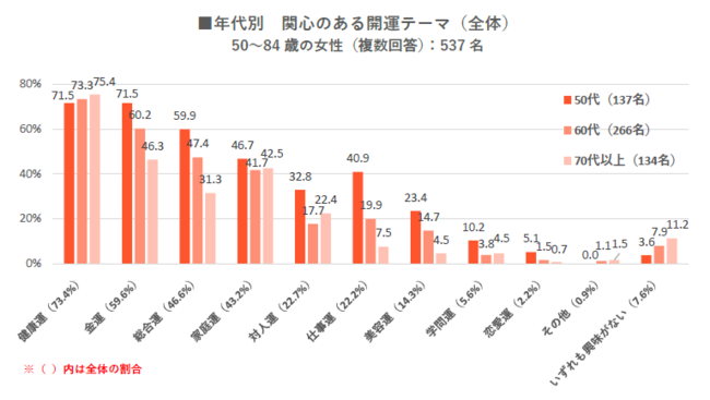 ⇒全体では健康運(73.4%)金運(59.6%)の関心度が高く、年代別では複数のテーマで50代が最も関心が高い。一方70代以上は、健康運に関心が集中。
