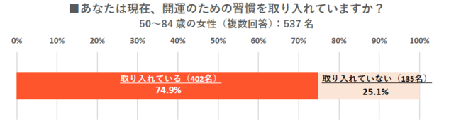 ・日常生活で何かしらの開運習慣を取り入れているシニア女性の割合は、全体の74.9%。