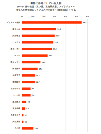 ・「占い師、占術研究家、スピリチュアル有名人」を開運の情報源としている人が特に参考にしている人物は、「ゲッターズ飯田」氏が54.5%と最も多く、次いで「星ひとみ」氏が31.2%、「江原啓之」氏が29.9%という結果に。