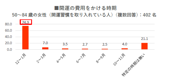 ⇒開運習慣を取り入れている人が1年間で開運にかける費用は平均で11,550円/年。お金をかける時期は年末年始に集中。
