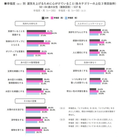 ・また、「挨拶をきちんとする」など人とのコミュニケーションに関する習慣、「玄関を綺麗にする」などの整理整頓の習慣、「姿勢をよくする」など身なりを気づかう習慣についても、心がけている人は幸福度が高い傾向にある。