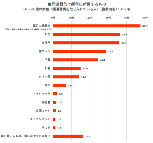 ⇒新年開運のために新調するものは、縁起物、お札、お守りが上位。次いで歯ブラシが28.9%、下着が24.4%。