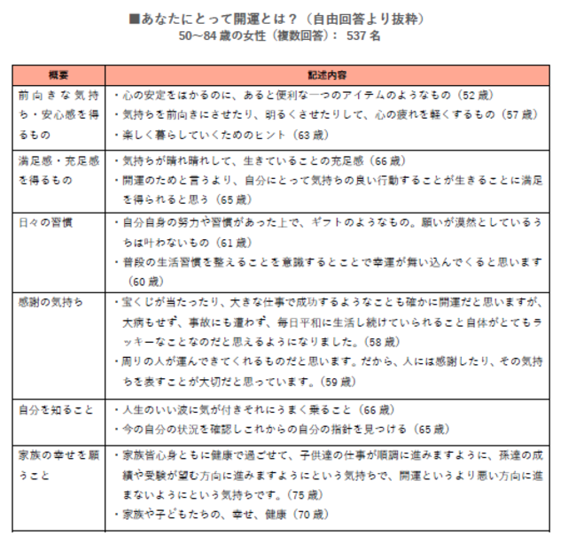 ・「あなたにとって開運とは何か」について自由回答で尋ねたところ、「前向きな気持ち・安心感を得るもの」「満足感・充足感を得るもの」「日々の習慣」などに関するコメントが見られた。