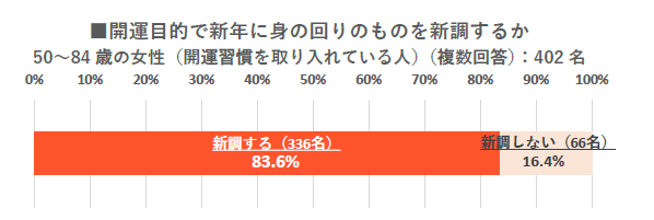 ・開運目的で新年に新調する人は83.6%。新調するものは、門松やだるまなど縁起物が47.5%、お札が36.6%、お守りが36.1%の順で、次いで歯ブラシが28.9%、下着が24.4%と日用品の中で多い結果に。