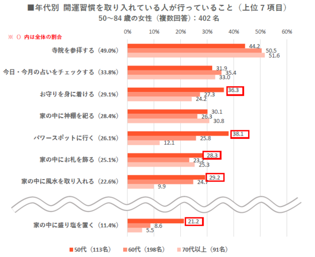 ・「お守りを身に着ける」「パワースポットに行く」「お札を飾る」「風水を取り入れる」などの開運行動は50代が最も高い。「盛り塩を置く」は全体では11.4%だったが、50代は21.2%。