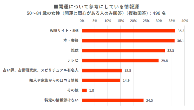 ⇒開運に関する主な情報源は、WEBサイト・SNSが36.3%と最も多く、次いで本・書籍が36.1%という結果に。