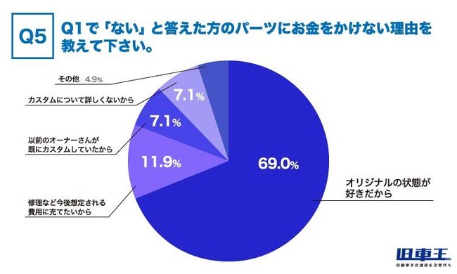 一方でお金をかけたパーツがないと答えた人の7割が、オリジナルの状態にこだわりたいと考えていることもわかりました。