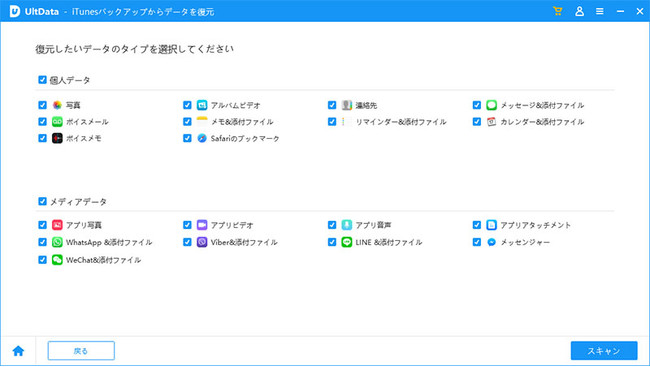 2、復元したい内容を選択して「スキャン」を押しましょう。