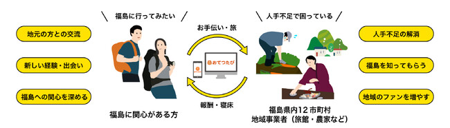 12市町村において、繁忙期に人手不足に陥る事業者と、首都圏等で福島に関心のある方々とをマッチングさせることで、「お手伝い」を通じた地域とのつながり創出を目指します。これにより、事業者の人手不足を解消するとともに、福島との関りを持つ「関係人口」の拡大を目指します。