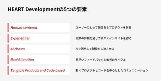 「HEART Development」は、「Human-centered」「Experiential」「AI-driven」「Rapid Iteration」「Tangible Products and Code based」の5つの要素から構成されている開発フローです。AI活用によって、迅速なプロダクト開発と仮説検証のサイクルを回しつつ、的確にユーザーフィードバックを拾えるため、ユーザー視点からプロダクトの改善と最適化を実現することができます。