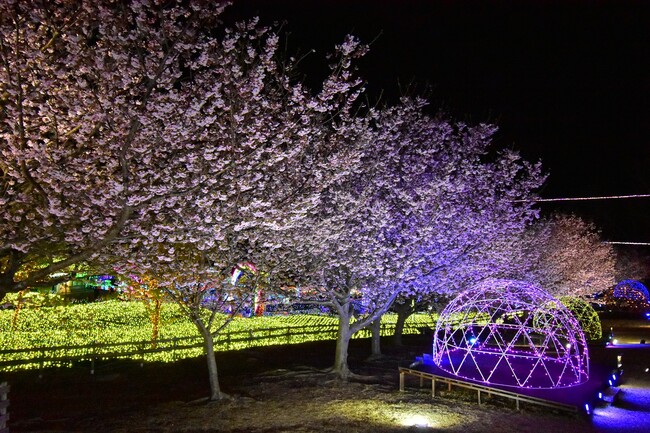 「城ケ崎桜」が満開になるころ園内では、日中は青空の下で桜を愛でながら芝生広場でゆったりと過ごし、夜はイルミネーションとライトアップされた桜の美しいコラボレーションをお楽しみいただけます。