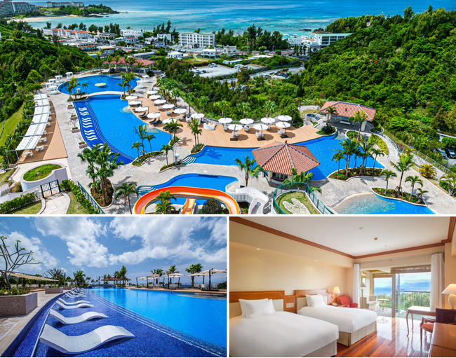 「やんばる」の森を思わせる緑あふれるロビーアトリウム。44平方メートル 以上の広い客室や、海に向かって広がる岡野上の170mのガーデンプールは圧倒的なスケール。夜まで泳げるナイトプールにオフシーズンも楽しめるホットプールを完備。