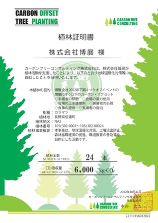 “ゼロ・エミッション型のイベントの実現”を目指す株式会社 博展(以下「当社」)は、10月に開催した全社キックオフイベントにおいて、環境負荷の低減への取り組みとカーボンオフセットを実施し、カーボンニュートラルなイベントを実現いたしました。