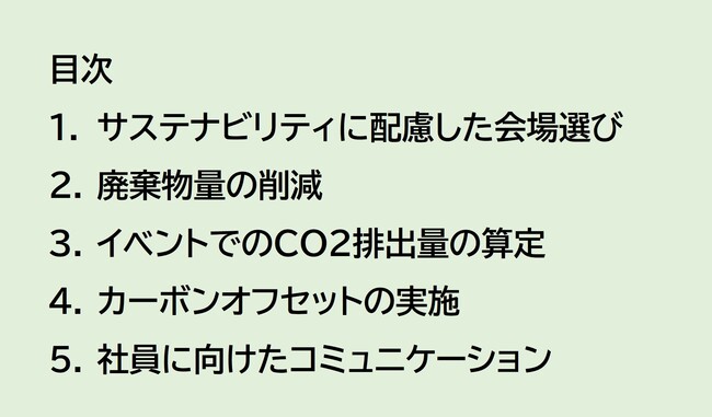 今後、当社が主催する社内イベントでの取り組みを皮切りに、ゼロ・エミッション型のイベントのモデルケースをつくり、顧客へのサービス開発を図ってまいります。