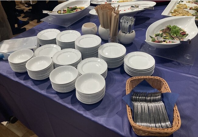 懇親会では、使い捨てプラスチック削減のため、陶器のお皿やシルバーのカトラリーを採用しました。