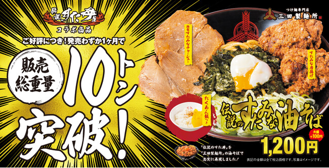 『伝説のすたみな油そば』は、特製すたみなチャーシュー・すたみな唐揚げなどの具材をふんだんにトッピングし、並盛で総重量約770g(※たくあん飯込み)、大盛り約900gと、三田製麺所の汁なし油そばシリーズでは史上最高峰のボリュームが「食べ応え満点!」「コラボのクオリティを超えている」「この夏一番のスタミナ商品!」とお客様からご好評の声を多数いただき、SNSでも話題沸騰中の人気商品となっております。