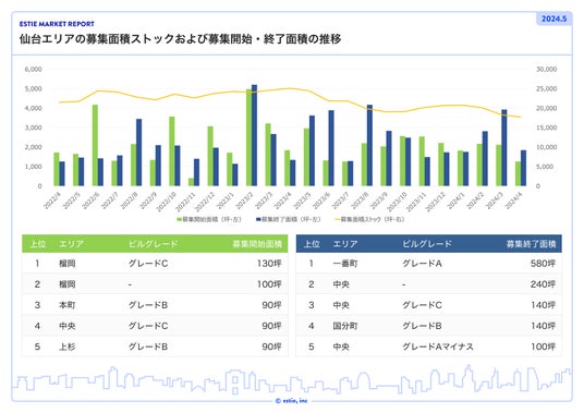 仙台エリアでは、募集開始面積が前月比約40.5%減の1,258坪、募集終了面積が前月比約53.1%減の1,838坪、募集面積ストックは前月比約3.2%減の約17,670坪となり、前年比は約29.5%減と5エリア最大幅で募集面積ストックは減少しています。