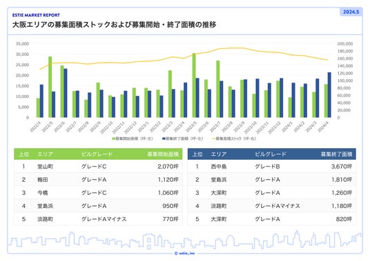 大阪エリアでは、募集開始面積が前月比約30.6%増の15,785坪、募集終了面積が前月比約16.3%増の21,413坪、募集面積ストックは前月比約3.5%減の約155,633坪となり、新規供給が前年・前月比ともに増加していますが、それ以上に大規模区画が複数あった影響も大きく、募集終了面積が増加しているため、募集面積ストックが減少しています。