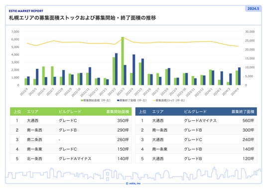 札幌エリアでは、募集開始面積が前月比約366.7%増の1,899坪、募集終了面積が前月比約52.4%増の2,317坪、募集面積ストックは前月比約1.9%減の約21,822坪となり、需要が供給を上回り募集面積ストックは引き続き微減となりました。