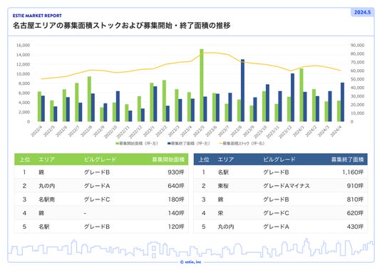 名古屋エリアでは、募集開始面積が前月比約3.4%増の4,377坪、募集終了面積が前月比約27.9%増の8,164坪、募集面積ストックは前月比約5.9%減の約60,042坪となり、名駅エリアの1,000坪超区画の募集終了影響のほか500坪以上区画の募集終了が複数あり、新規供給を上回ったため募集面積ストックは減少しています。