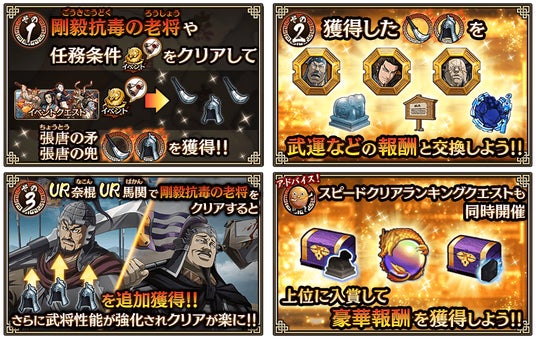 開催中のイベント『武人としての誇り』のイベントクエストに、新武将『UR奈棍』『UR馬関』を編成すると、交換用アイテムが追加でドロップ!報酬アイテムへの交換が容易になります!