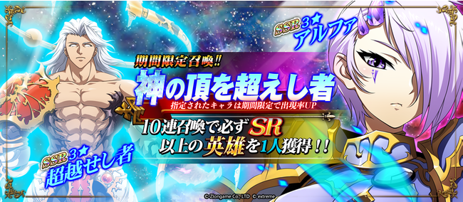 『神の頂を超えし者』は10連召喚で必ずSR以上の英雄を一人獲得できる、期間限定召喚です。SSR超越せし者、SSRアルファの出現確率が期間限定でアップします。