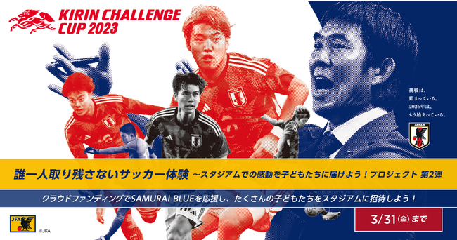 概要:集まった応援資金からシステム利用料などの経費を差し引いた金額を活用し、様々な理由によりサッカー日本代表戦のスタジアム観戦が困難な子どもたちを6月に開催するキリンチャレンジカップ2023に招待します。