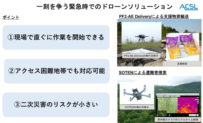 株式会社ACSL (本社:東京都江戸川区、代表取締役CEO:鷲谷聡之、以下、ACSL)は、有限会社タイプエス(本社:群馬県前橋市、代表者:設樂丘、以下、タイプエス)と合同で、国産ドローンのSOTEN(蒼天)およびPF2-AE Deliveryを活用した災害時の支援物資輸送及び遭難者捜索の実証実験を実施しました。ACSLは、本取組の成果をPR動画として公開し、幅広くお客様へ活用事例のご紹介を進めることでドローンが活躍する未来を創造していきます。