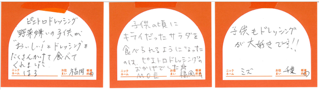 「ピエトロドレッシング 和風しょうゆ」3億本突破に向けて、当社が開催した各イベントでお客様の「ピエトロドレッシングとの思い出」を直筆でご記入いただいたところ、500件を超えるありがたいお声を頂きました。その中でも、“ピエトロドレッシングで子どもの野菜嫌いがなおった”というお声が多く、これまでも継続的に取り組んできた活動である「野菜嫌いをナオソ。」をスローガンとする『100万人へおいしさ届けるプロジェクト』を発足いたしました。