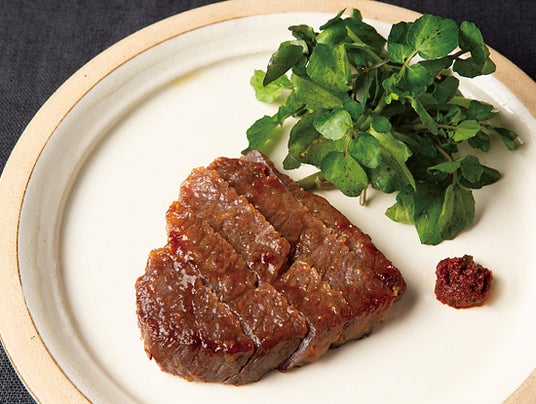 一頭から約4~5kgしか取れない希少部位「とも三角」を贅沢に使用しました。味噌漬けにして焼くことで、信州牛の旨味が増し箸が進みます。