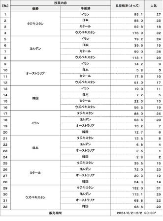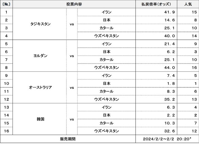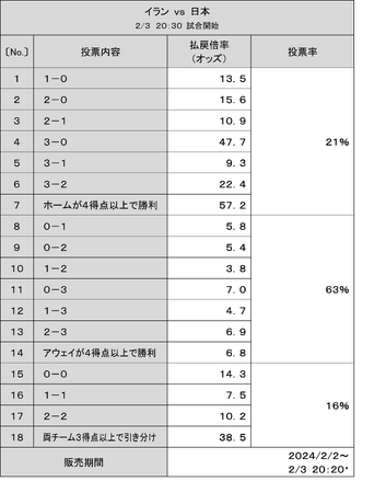 ・2月3日(土)開催予定の準々決勝(vs イラン)、日本の勝利予想は、63%※2。1番人気の投票は、1-2で日本勝利で、払戻倍率(オッズ)は3.8倍!
