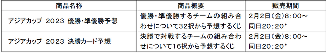 なお、「アジアカップ 2023 優勝・準優勝予想」や「アジアカップ 2023 決勝カード予想」は、本日20時20分まで、「WINNERサッカー1試合予想(イラン vs 日本)」は、2月3日(土)20時20分まで販売*いたします。
