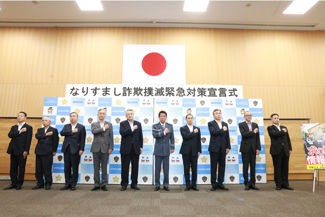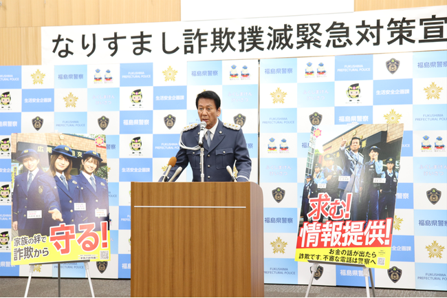 当日、福島県でのなりすまし詐欺増加を阻止すべく、『なりすまし詐欺撲滅緊急対策宣言式』が行われ、杉対策監が参加しました。そのなかで、「福島県ではなりすまし詐欺の件数が減少傾向にあるものの、被害額が増加しています。これは許せることではありません。私たちも対策を進めていきますが、なかなか行き届かないところがあるので、福島県の皆さんに協力していただきながら、特殊詐欺がない県を目指していきたいです。よろしくお願いします!」と詐欺被害撲滅への決意を述べました。