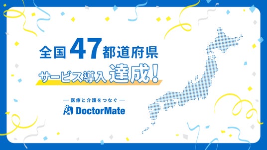 介護事業所向けに医療ソリューションを提供するドクターメイト株式会社(本社:東京都中央区、代表取締役・医師 青柳直樹)は、この度、当社の提供する各種サービス(夜間オンコール代行(TM)、オンライン診療サポート、医療教育サービス「Dスタ(DM-study)」など)の導入施設が、鳥取県の導入をもって全国47都道府県すべてに拡大したことをお知らせいたします。