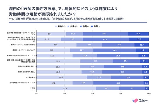 「労働時間が短縮された」「多少短縮された」と回答した医師への、労働時間の短縮で効果が大きかった施策についての質問では、「タスク・シフト/シェア」と「医師の夜間業務の見直し」が上位を占めていました。一方で、効果が「大きい」と感じている割合は最大でも18.5%にとどまり、いずれの施策もその効果が限定的であることが示されています。
