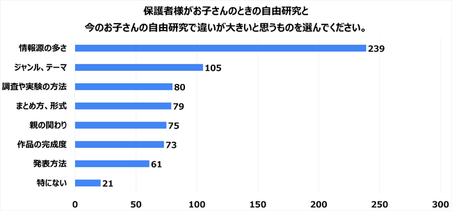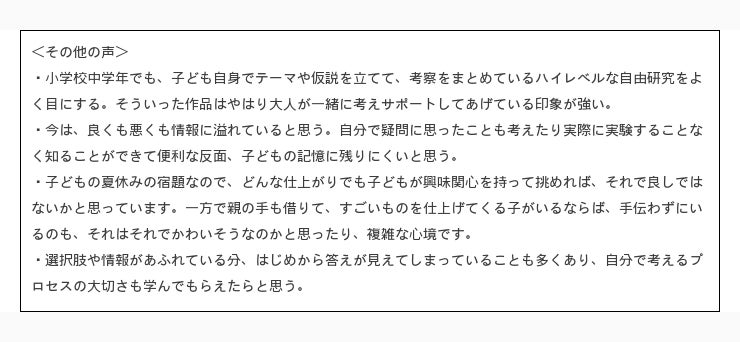 情報源の多さに関しては「調べようと思えば子どもでも専門的な知識にアクセスできるので、選んだテーマについてより深く知ることも出来る」というポジティブな意見もありましたが、「テーマ決めから、情報収集まで、簡単に出来てしまう」「情報源が多すぎて、確実に信頼できる情報を探すのが大変」「どこかのメディアやSNSで見たような作品も多々見受ける今の自由研究は、私が小学生時代に1人で四苦八苦しながら作った簡素な作品にあった個性のようなものが感じられないものも多い」など、課題に感じている声も多くありました。
