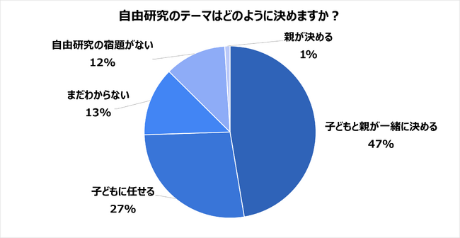今回の調査では自由研究のテーマを誰が決めているかを聞きました。「親が決める」と「子どもと親が一緒に決める」というように、親が関わっているとの回答が48%と半数近くになりました。