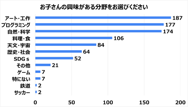 今回の調査では、自由研究の題材を考える上で、子どもの興味がある分野は何かを親に聞きました。最多は「アート・工作」の187人になり、次に「プログラミング」「自然・科学」となりました。「アート・工作」「自然・科学」のテーマは親が子どもの時代も多く見かけた自由研究のテーマですが「プログラミング」は現代だからこそのテーマと言えます。