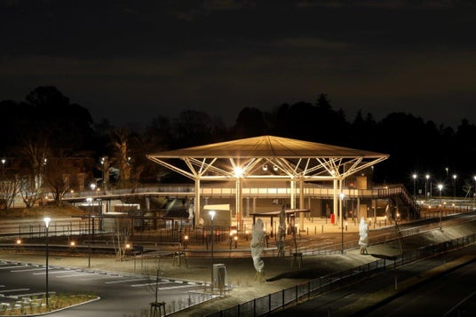 「つなぐ・つながる・つなげる」のコンセプトに沿った道の駅のイベントスペースとして太陽工業(株)と協力し、設計しました。屋根の形状は「べに花」の輪郭をイメージした多角形とし、膜屋根の透光性と軽量感を生かすことにより、建物全体との繋がりや明るい空間となるようにしました。また、夜間では照明により膜屋根をオレンジ色に照らし「べに花」を演出しています。設計者として、道の駅「べに花の郷おけがわ」を通して、桶川市全体の賑わいが増していくことを願っています。