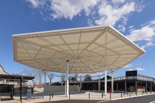 道の駅に完成したイベントスペースの上屋は、桶川市のシンボルであるべに花の形状をモチーフとしています。立体感のあるべに花の形状を再現すべく、軽量で開放感のある膜屋根が採用されました。膜素材は薄く、軽量で耐震性の高さが特徴です。白いPVC膜の材料は表面処理の酸化チタン光触媒*の性能により、有機物による汚れが分解され雨水で洗い流されることで白い外観が長期にわたり保たれる高い防汚性が特徴です。