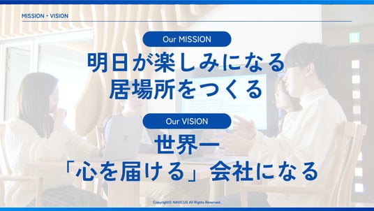 こちらは、第8期までVISIONだったものをこの度MISSIONに制定いたしました。NAVICUSは、家庭や会社・SNS・地域社会・趣味やエンタメといった、誰かとつながるもののすべてが一人ひとりの居場所であると捉えています。