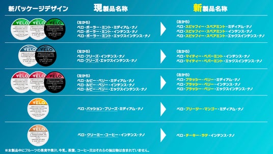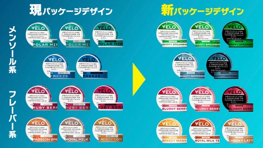 メンソール系やフレーバー系といった様々なフレーバーラインナップと、ミディアム、インテンス、エックスインテンスの3段階の刺激レベルの選択肢から、自分に合った製品をお選びいただけるオーラルたばこ「VELO」。この度、フレーバーの味わいや刺激レベルが直感的に分かりやすくなるよう、パッケージデザインを一新します。