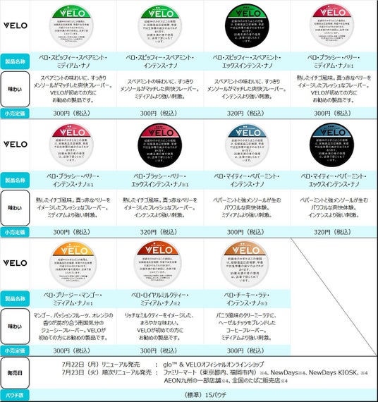 BATジャパン(本社:東京都港区赤坂、社長:エマ・ディーン、正式社名:ブリティッシュ・アメリカン・タバコ・ジャパン合同会社)は、いつでもどこでも楽しめる新ジャンル・オーラルたばこ「VELO(ベロ)」の販売中の全11銘柄のパッケージデザイン、および10銘柄の製品名称を、2024年7月22日(月)より順次リニューアルして新発売します。