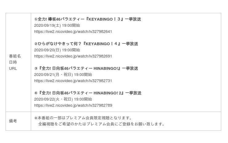 9月19日(土)~22日(火・祝)の毎日19時より、日向坂46の1stアルバム『ひなたざか』のリリースを記念し、「日向坂46」/「けやき坂46」出演の【BINGO!】シリーズを、シーズン毎にニコニコ生放送にて一挙放送致します。