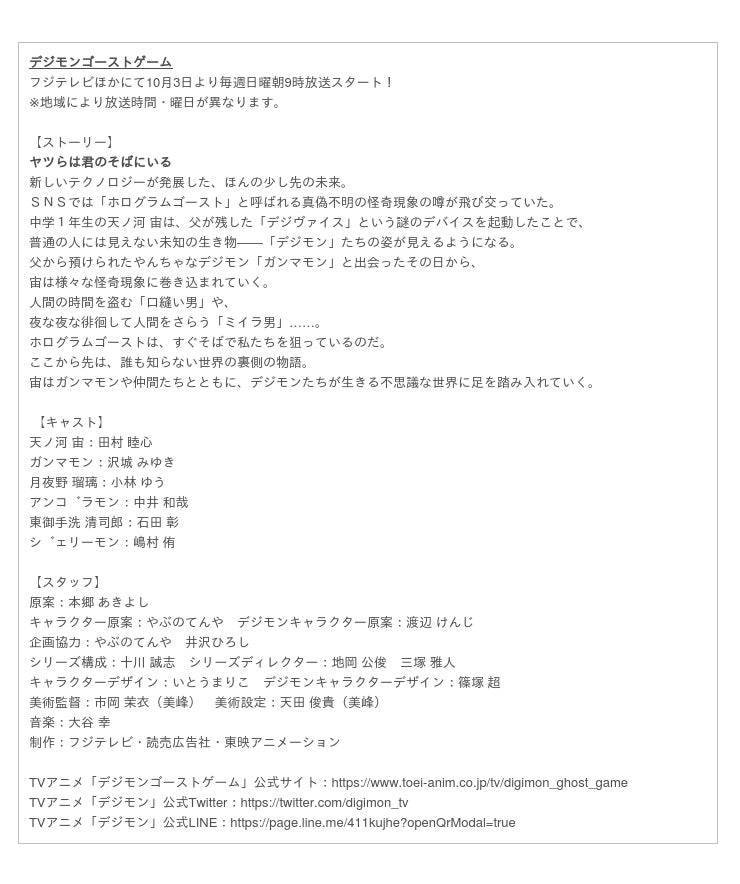この度、8月1日のデジモンメモリアルデーに発表された「デジモンゴーストゲーム」のメインビジュアルが解禁になりました。また、主要スタッフも発表となり、企画協力にやぶのてんや、井沢ひろし、シリーズ構成に十川 誠志。シリーズディレクターには、「デジモンアドベンチャー」~「デジモンセイバーズ」など歴代TVシリーズで演出に携わっていた地岡 公俊。「デジモンアドベンチャー:」でシリーズディレクターを務めた三塚 雅人が担当いたします。