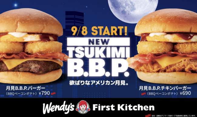 ウェンディーズ・ジャパン株式会社及びファーストキッチン株式会社(代表取締役:紫関修 所在地:東京都新宿区)では、9月8日(木)より、ウェンディーズ・ファーストキッチン全店にて、食欲の秋にピッタリなアメリカンスタイルの欲ばり “月見バーガー” を発売します。丸いたまごとハッシュポテトをお月様に見立てて、肉厚でジューシーなパティと旨味たっぷりのソースを組み合わせた、ボリューム満点な秋季限定ハンバーガーです。