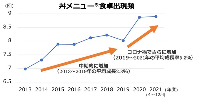 共働き世帯の増加などを背景に、主菜と主食を一皿で食べることができる丼メニューの食卓出現頻度は中長期的に伸長を続けており、コロナ禍でさらに増加しています(出典:株式会社ライフスケープマーケティング「食MAP」、右図参照)。