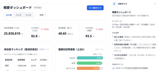 FF-Dataは2022年・2023年の年次データ、出入国管理統計は2024年、2025年のデータ、コロナ前との比較用としてそれぞれ2019年のデータを含む形で搭載しています。